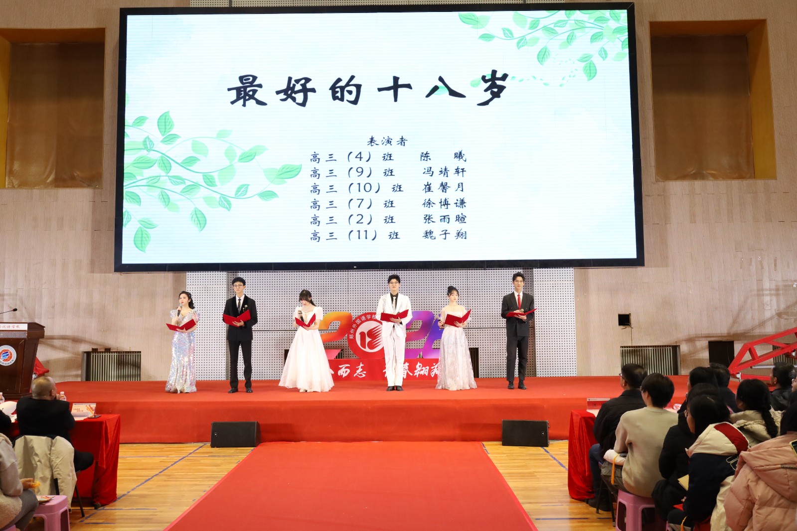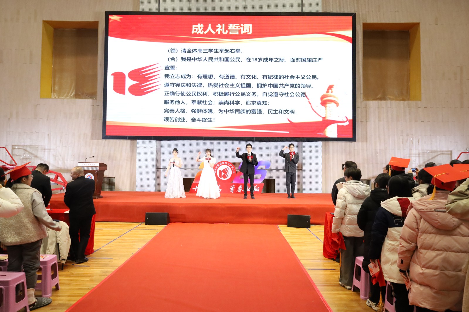 成人礼在庄严的国歌声中拉开帷幕。仪式由高三代表陈曦、徐博谦两位同学主持,他们以诗意的语言阐释了十八岁的意义:“冠礼之年是人生征途上的又一处新驿站,自此肩负重任,步履笃行赴山海。”