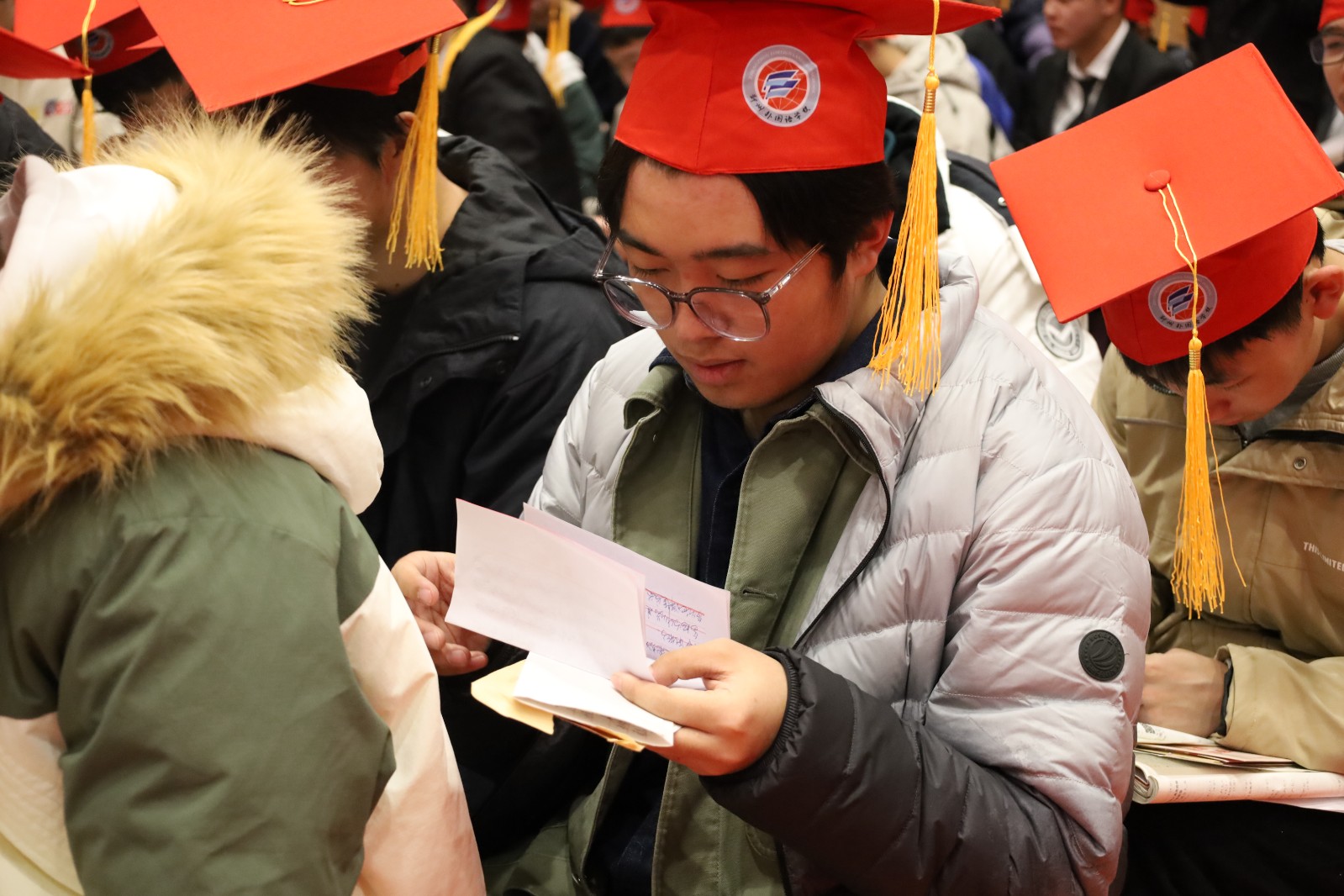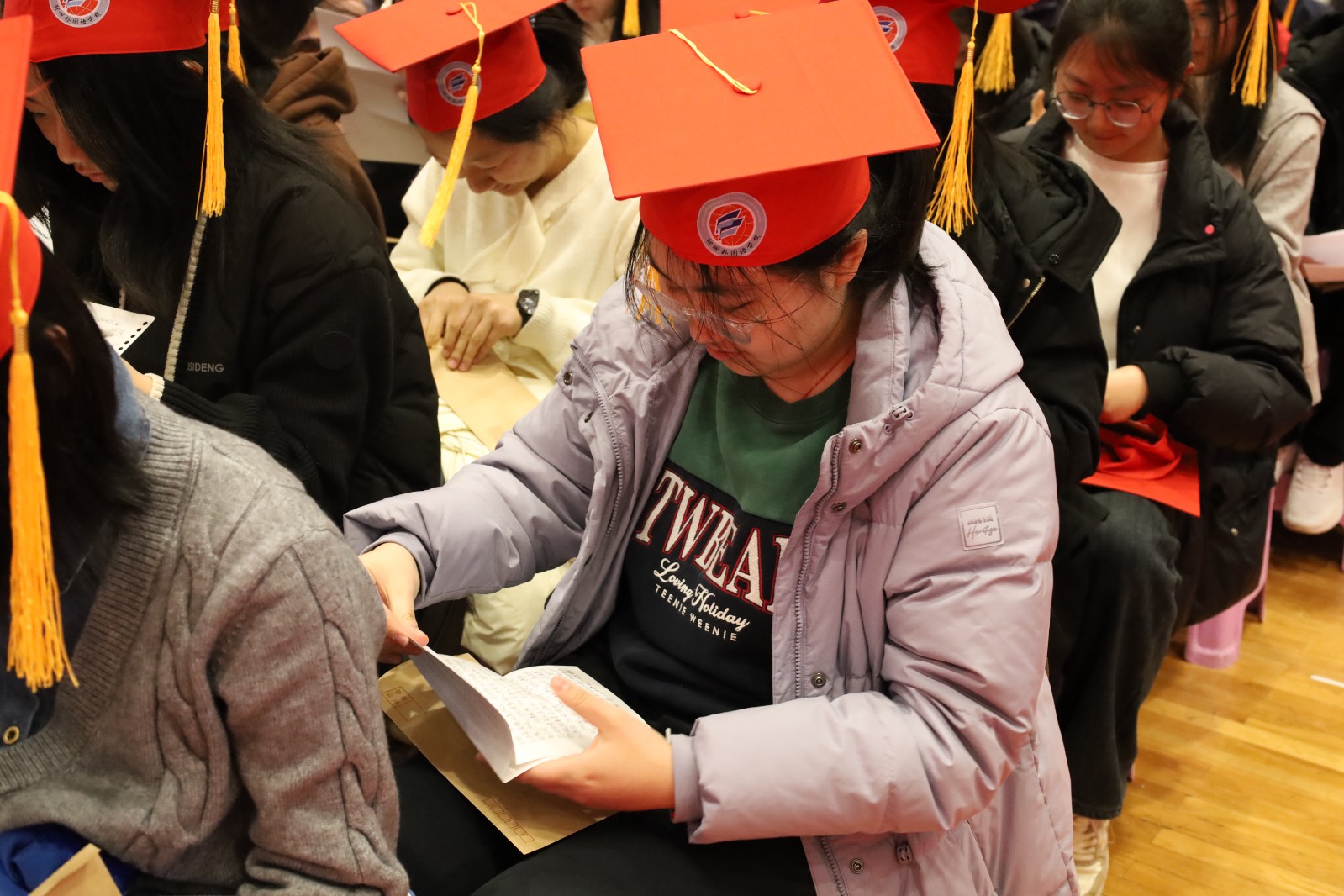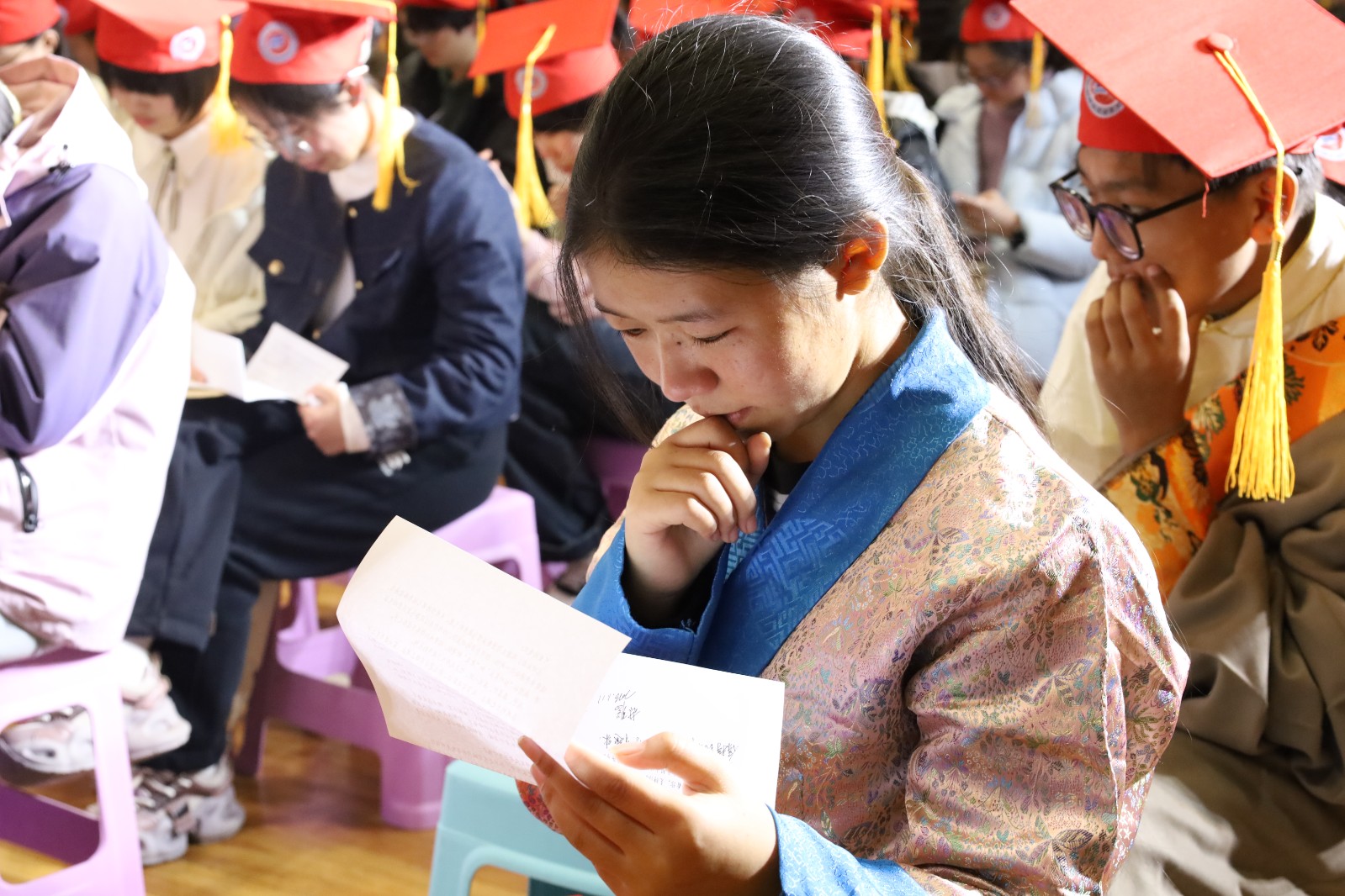 亲情环节温馨感人,家长祝福视频与现场家书阅读让许多学生热泪盈眶。家长代表程桂芳女士表达了对孩子们成长的欣慰与期盼,叮嘱他们勇担责任、心怀感恩。